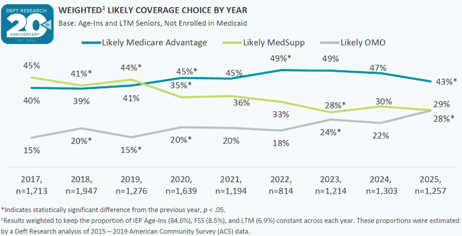 The 43% of Age-Ins who initially lean toward selecting MA as their first destination in Medicare is the lowest since a shaky COVID economy collided with shady TPMO marketing to drive MA initial preference to record highs. MedSupp preference has held steady these last three years while Original Medicare Only (OMO) has ticked up — more likely of an indictment of MA due to its recent challenges than a full-throated endorsement of Original Medicare. Previous Deft studies have shown that many Age-Ins initially leaning toward OMO learn more about the pros of the two private options — and more about the cons of 20% coinsurance — during their IEP and end up enrolling in MA or MedSupp versus settling on standard, government-issued healthcare.